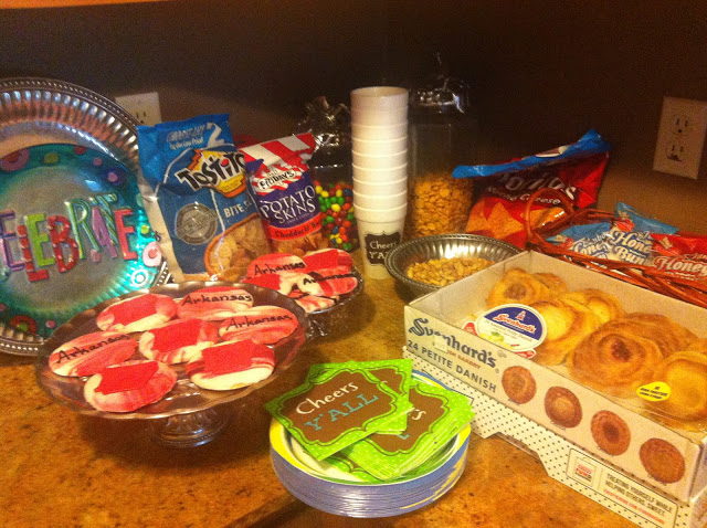 My sister is seriously the bomb.org hostess! She opened her home to all of John’s groomsmen so that they could crash there after their Bachelor party. Most of his friend are Yankees from the North so she had Arkansas cookies made and had “Cheers Y’all” napkins & cups and every kind of southern food she could think of! Southern hostesses really do it right!