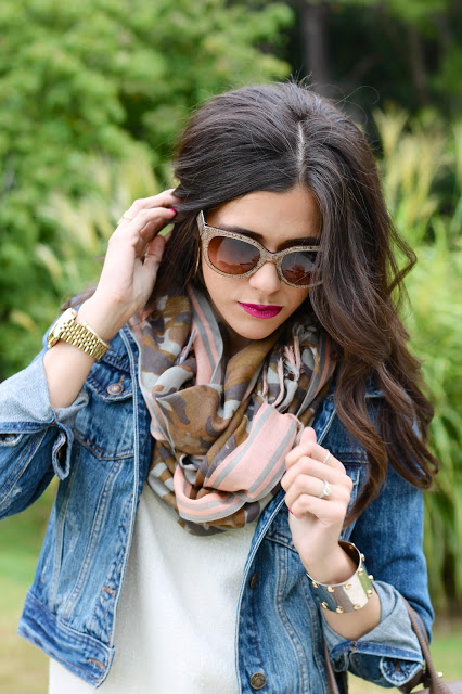 Tweed Top, Elysian Boutique (simliar here) c/o || Denim Jacket, Forever21 || Pants, J. Crew (obsessed) || Camo Scarf, J. Crew || Watch, MK || Silver Cuff, Forever21 || Bag, 3.1 Phillip Lim Pashli in Taupe || Sunglasses, Prada || Shoes, Zara