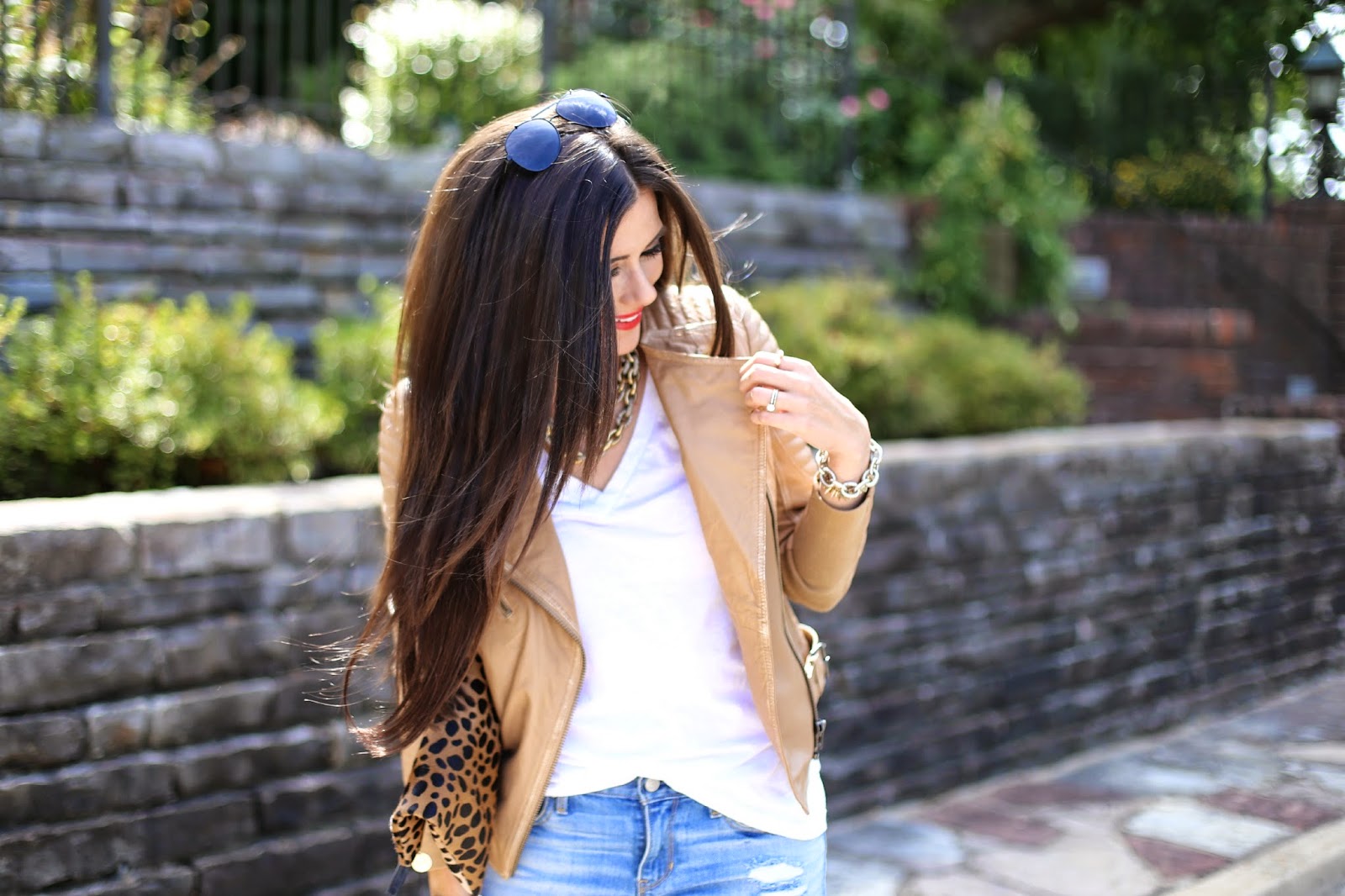I'm been looking for the perfect camel colored moto leather jacket forever – this one is really cute! I love how you paired it with crisp white and light-washed denim…perfect for late summer! 🙂