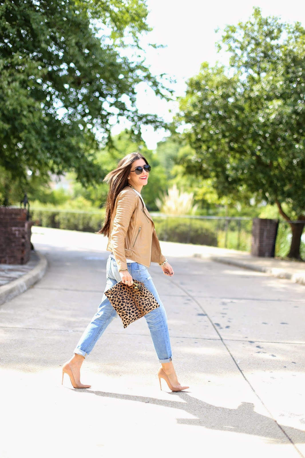 I'm been looking for the perfect camel colored moto leather jacket forever – this one is really cute! I love how you paired it with crisp white and light-washed denim…perfect for late summer! 🙂