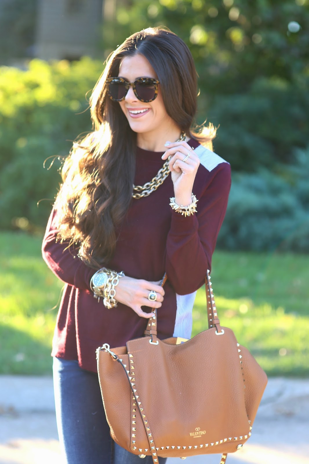 SWEATER: J.Crew (on sale!! +30% off) | DENIM: Paige (w/o zipper – on sale) | PUMPS: Christian Louboutin (similar here & here) | BAG: Valentino (similar here & here’s a studded satchel under $60) | SUNGLASSES: Karen Walker (currently 25% off- ends today!) | NECKLACE: old (similar here & love this!) | WATCH: Michael Kors | BRACELETS: BaubleBar c/o, David Yurman, Alex & Ani, SoCal Gems c/o | RING: David Yurman | LIPS: ‘Soar‘ w/’fleshpot‘ & Dior Maximizer