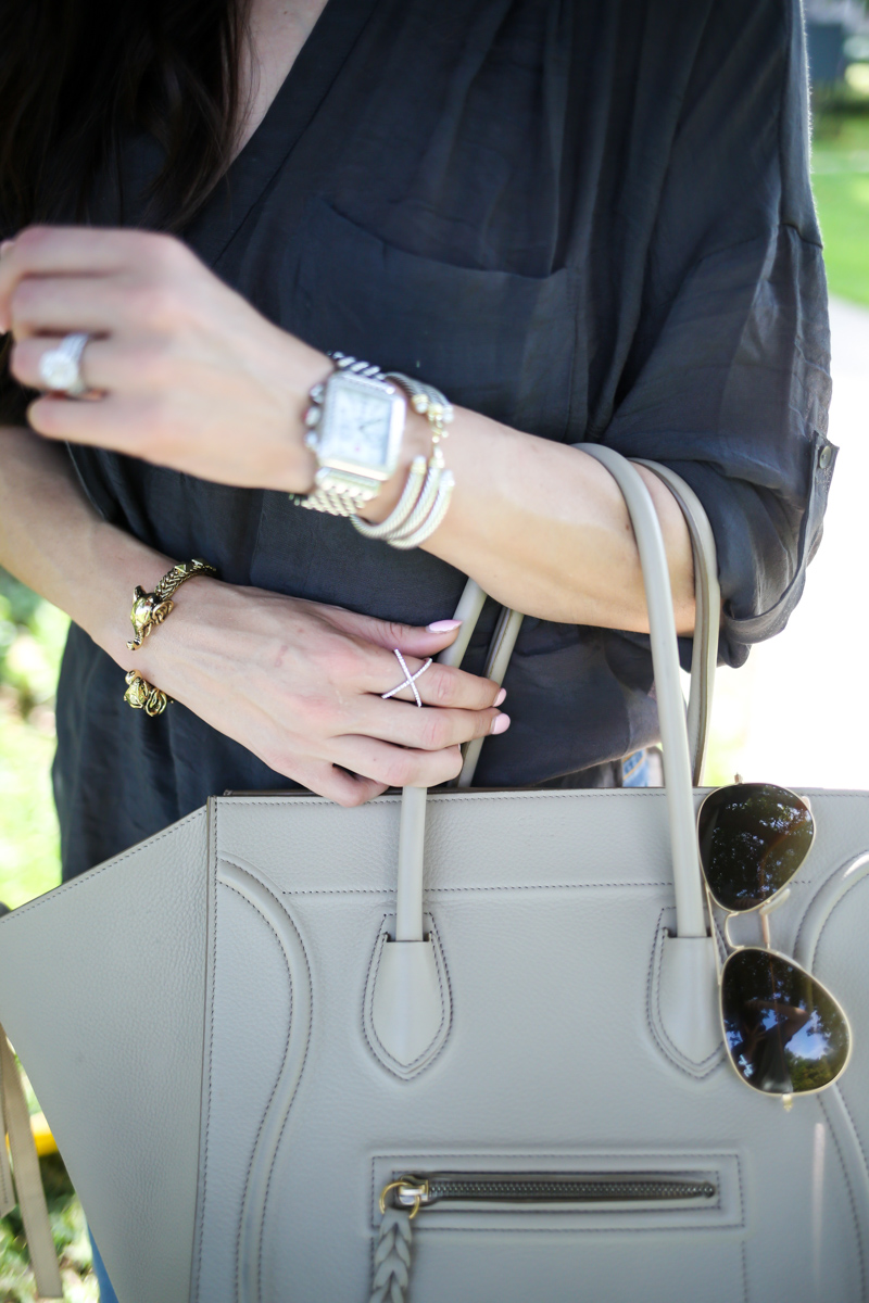 TUNIC: Astr | DENIM: BP ($62 – love these- recommend if you like high waisted!) | BOOTIES: Jeffrey Campbell | BAG: Celine (similar style here) | SUNGLASSES: Ray-Ban | WATCH: Michele | BRACELETS: David Yurman, BaubleBar | LIPS: Whirl | RING: BaubleBar