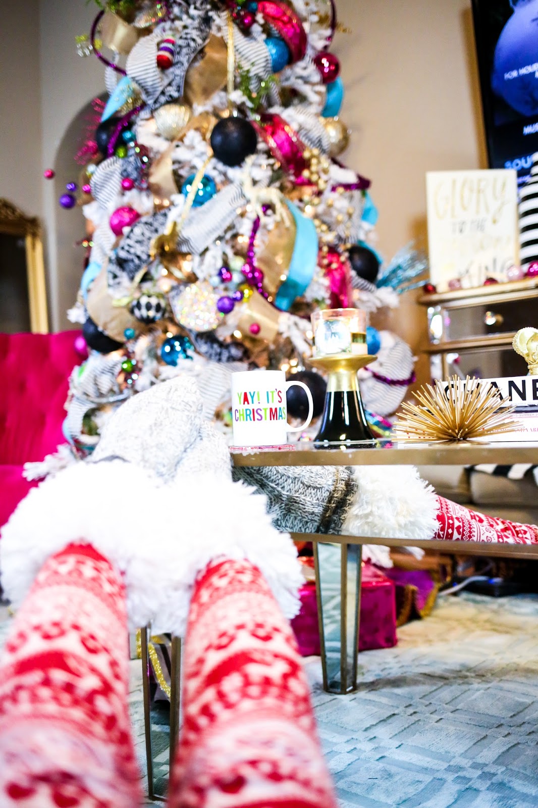 Love your tree it is beautiful!! So colorful and fun!! Your leggings are super cute and I LOVE fuzzy socks!!! They are seriously the best! 🙂