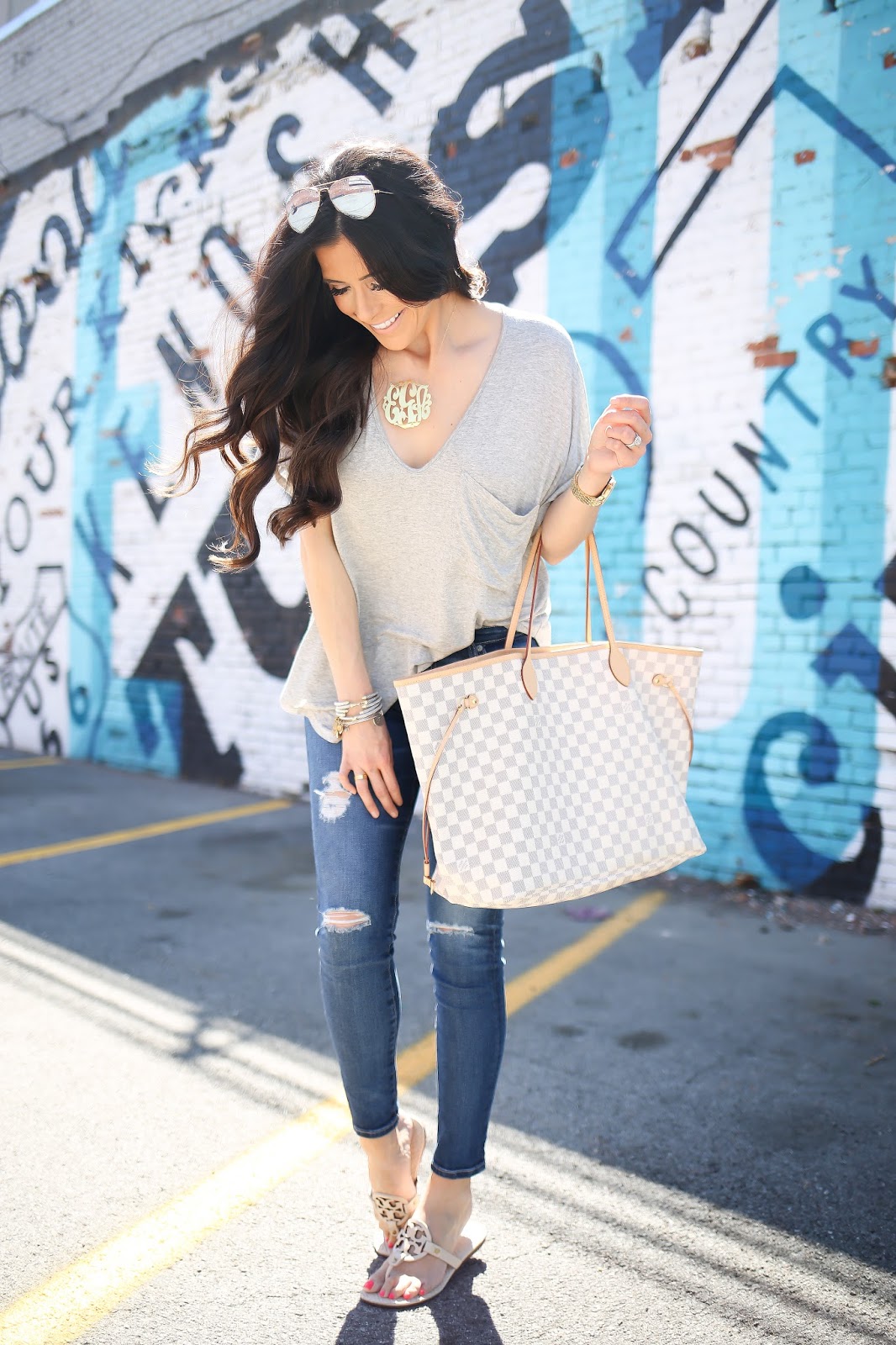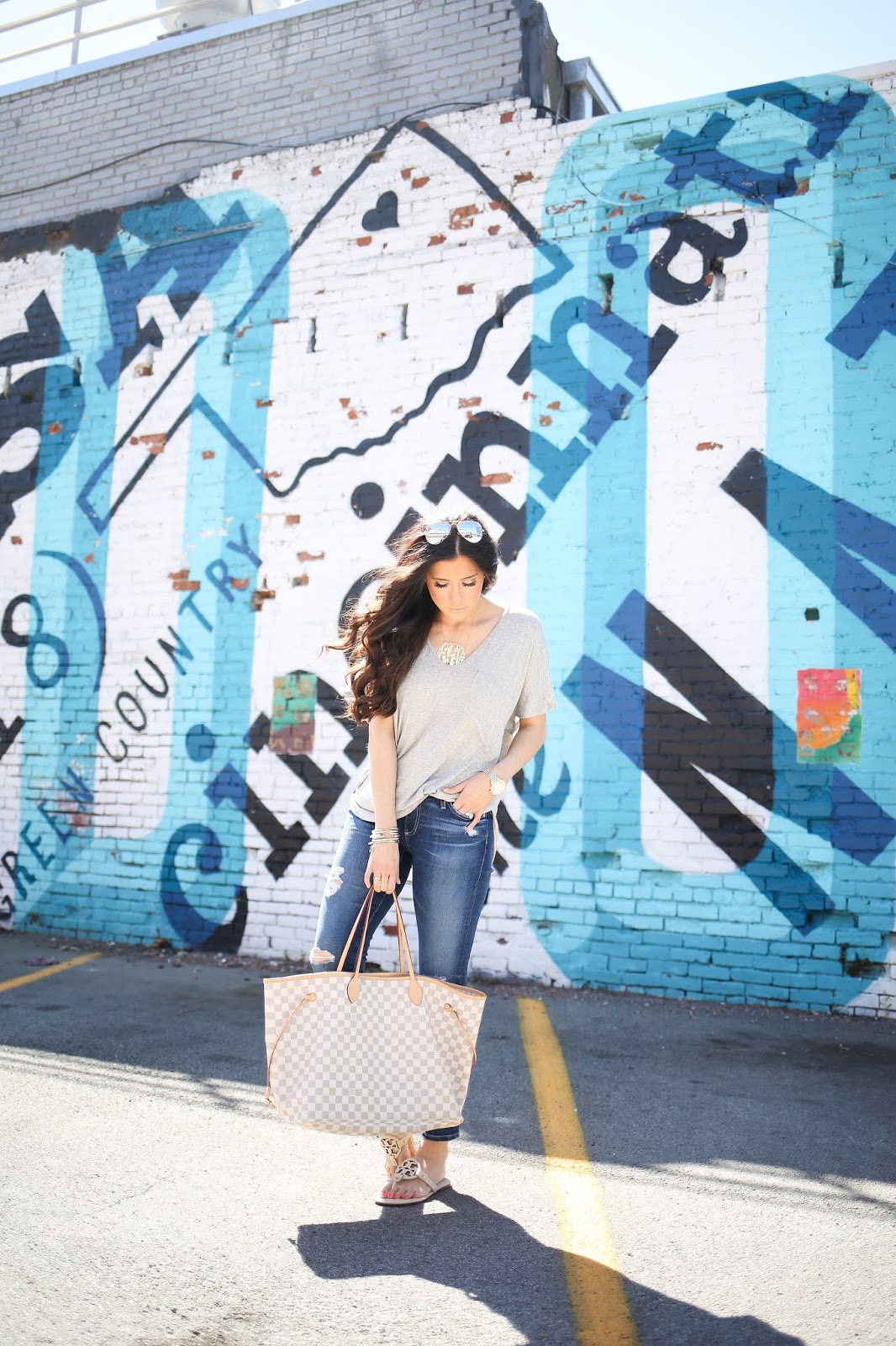 TEE: Lush | DENIM: AG | HANDBAG: Louis Vuitton Neverful GM (dupe here ) | NECKLACE: Love Always | WATCH: Michele | BRACELETS: David Yurman (herehere, my fave is here| RING: Cartier | SUNGLASSES: Celine (similar) | LIPS: Pure Zen + Undressed | SANDALS: Tory Burch (similar here) | EARRINGS: Kenneth Jay Lane (obsessed w/these!)