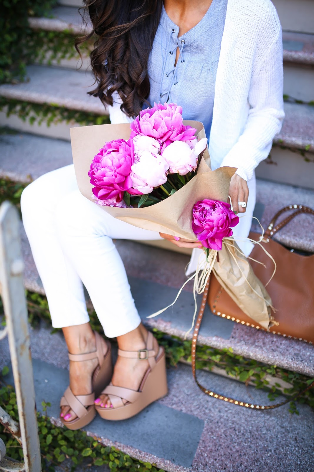 Such a beautiful look! I love it when you hold peonies in your photos. You have convinced me that I need a pair of white jeans ASAP!