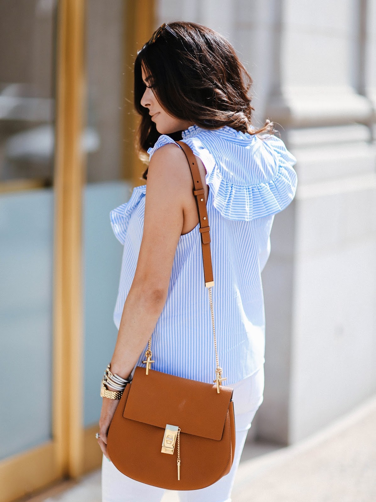 TOP: Topshop | DENIM: J.Brand (these are under $100 & great, too!) | HEELS: Steve Madden | HANDBAG: Chloe (this is a dupe from the Nsale for $30) | EARRINGS: Nordstrom | SUNGLASSES: Karen Walker | LIPS: ‘Stripdown’ + ‘Myth’ + Plumping Gloss | WATCH: Michele (also loving this Michele watch from the Nsale) | BRACELETS: David Yurman, here, hereHermes | Nails are an Orly mint green gel.