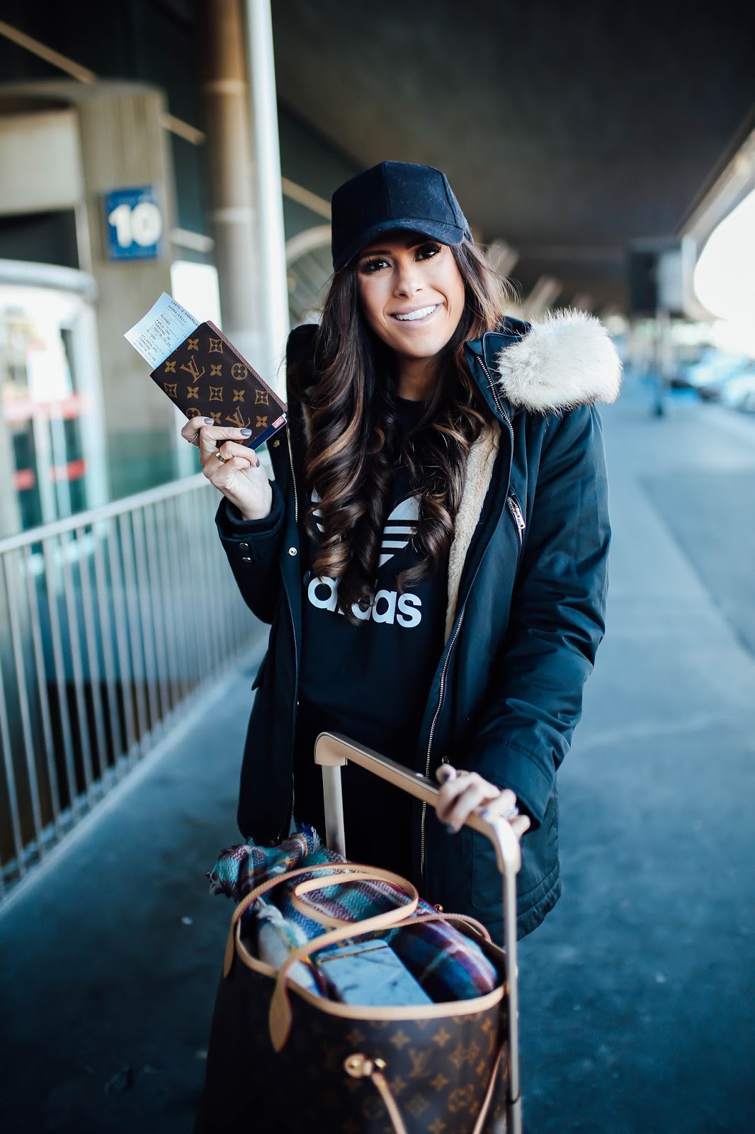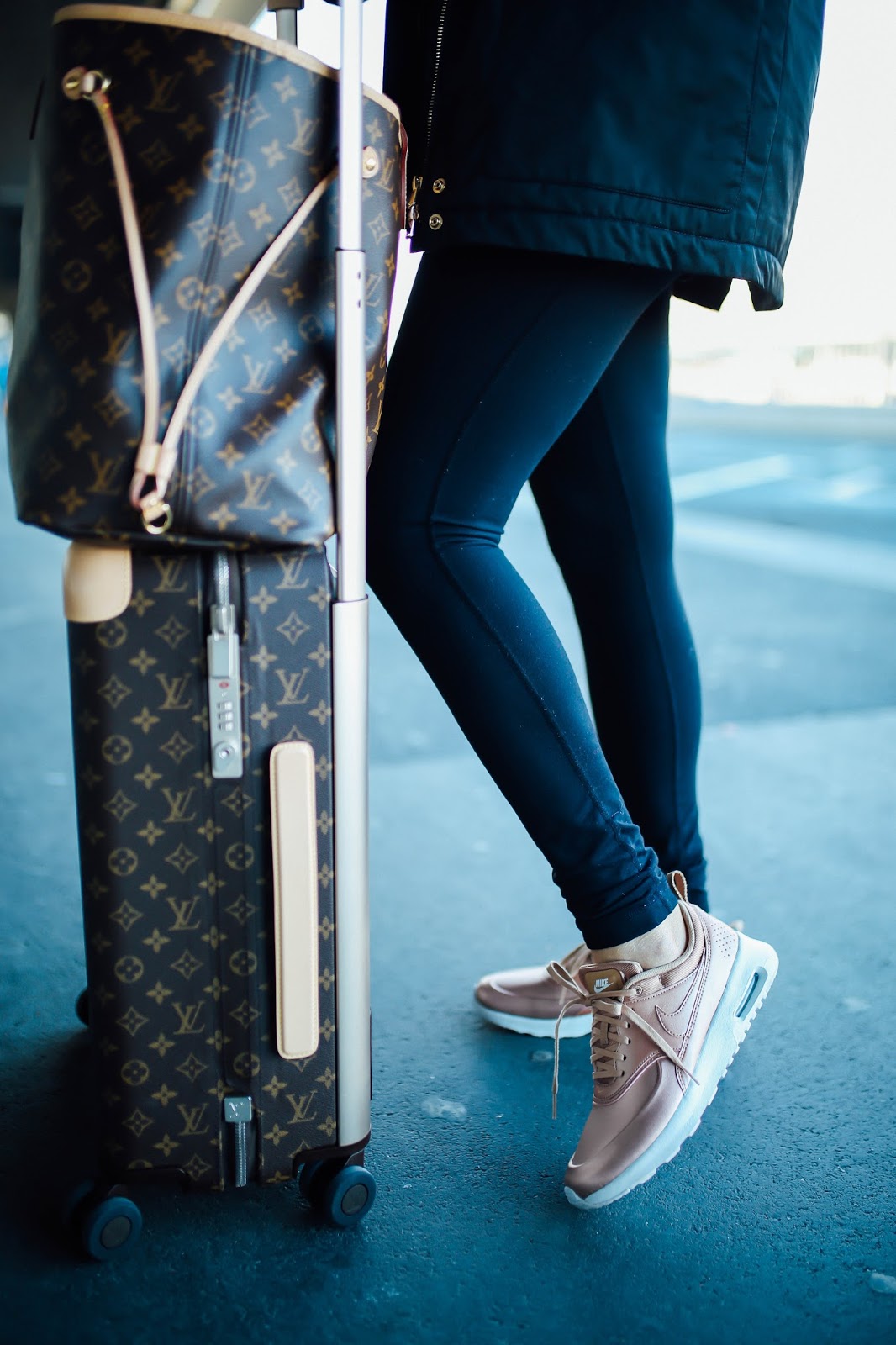 SWEATSHIRT: Adidas | LEGGINGS: Zella (I have 3 pair – the best leggings!) | TENNIS SHOES: Nike (size UP, these run small!) | TOTE: Louis Vuitton Nevderful GM (used HERE) | LUGGAGE: Louis Vuitton Horizon 55 (used HERE or how cute is this baby pink carry on?) | BASEBALL CAP: BP (I wear this hat ALL the time!) | EARRINGS: Nadri | BLANKET SCARF: Love Always | JACKET: purchased in Paris (similar HERE & HERE)