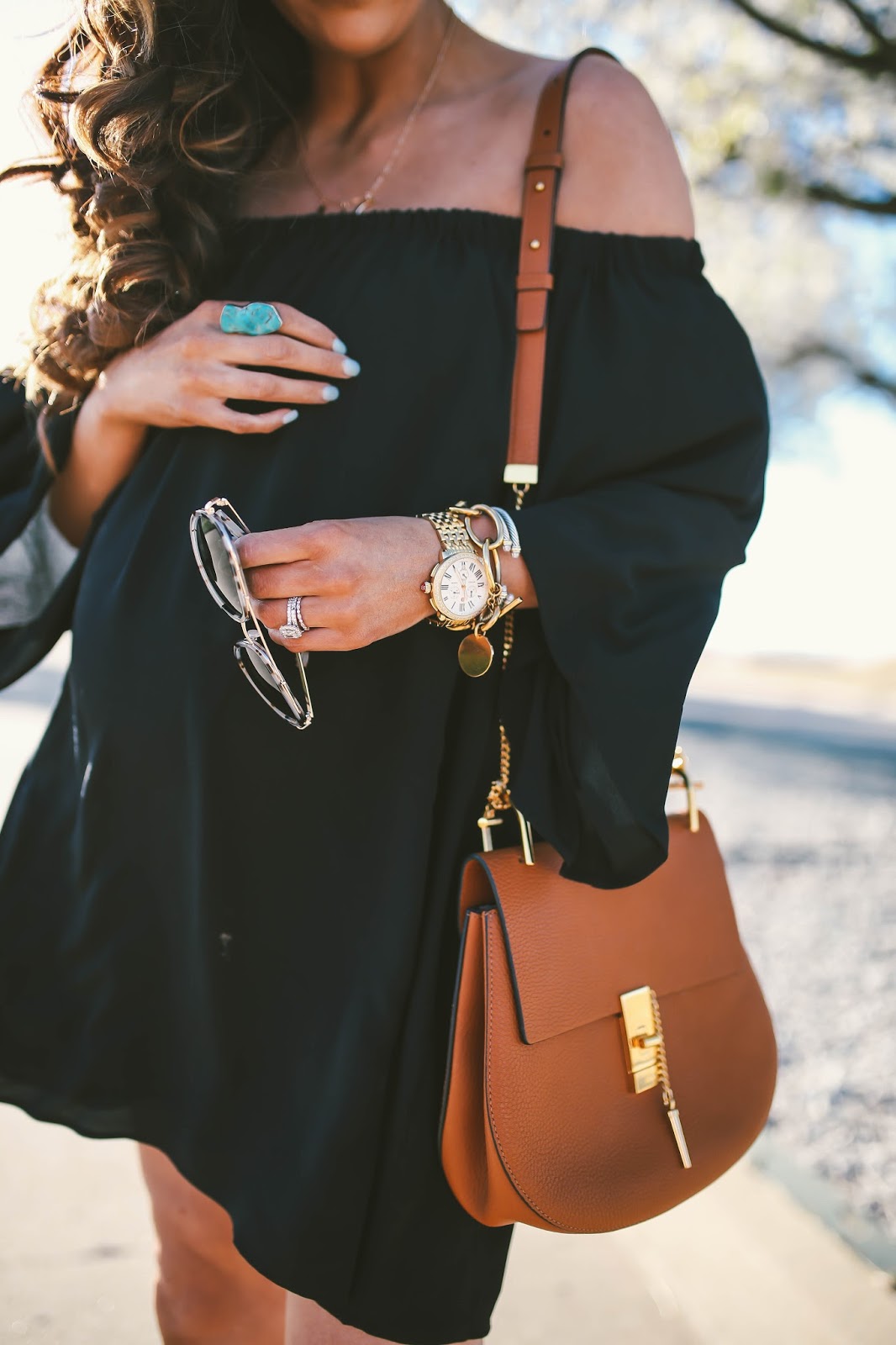 DRESS: French Connection (seriously good quality and I want to wear it on the daily!) | WEDGES: Jeffrey Campbell | SUNGLASSES: Kendall & Kylie | HANDBAG: Chloe (dupe HERE for $35) | BRACELETS: David Yurman, Amber Sceats (similar HERE) | WATCH: Michele | RING: Natalie B | NECKLACE: Styled Collection c/o | LIPS: “Om” (the best matte lipstick EVER – I am obsessed with this line!)