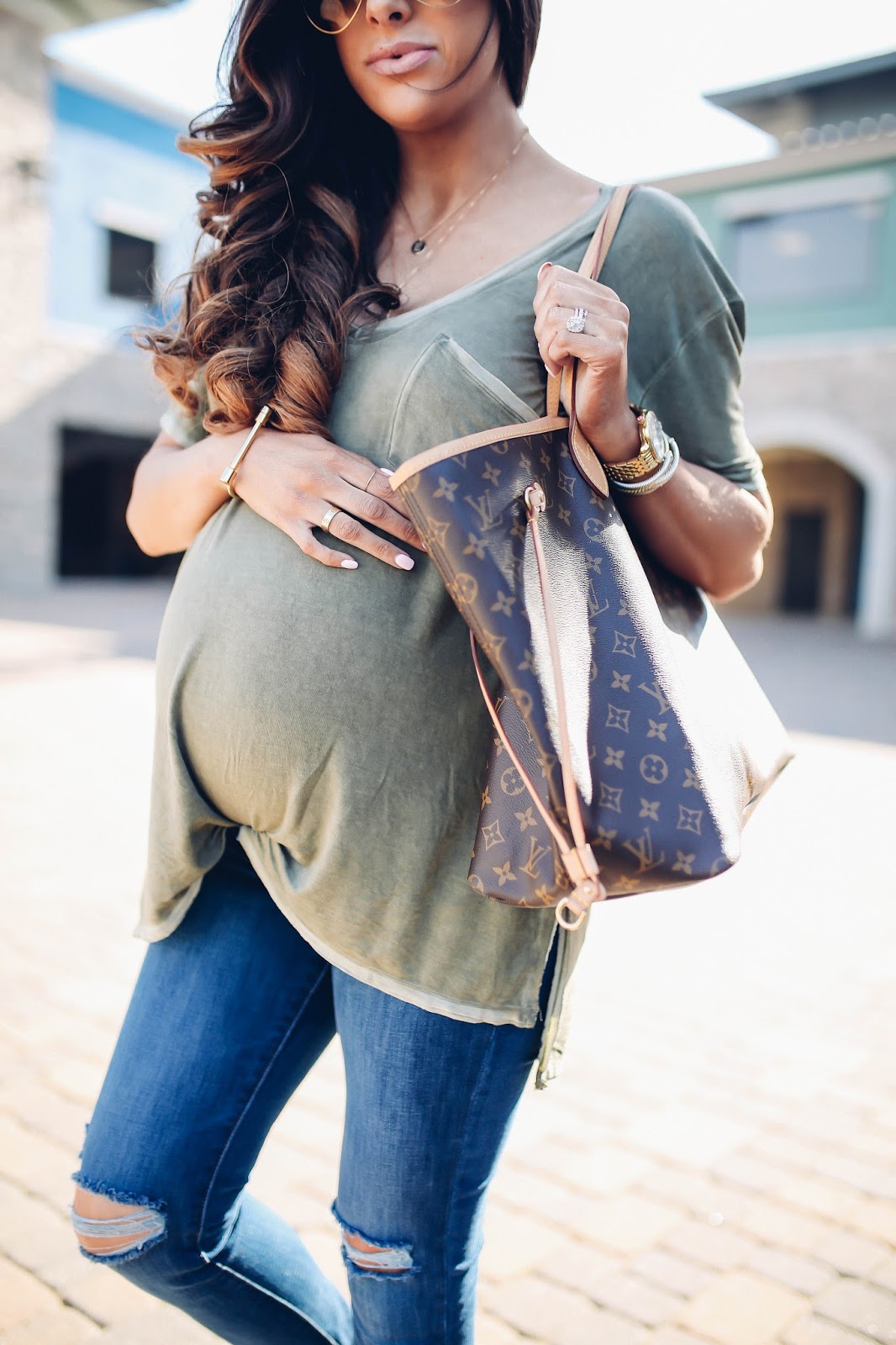 I thought I’d share a few photos of these simple outfit I wore the other day – mainly because I LOVE these tees! I got this one in Dallas the other day and when I got home and put it on I immediately wanted more. These are SO soft and the cut is so cute and flattering. Some tees are sort of boring or plain, but these have a cute shape and fit. I had to size up two sizes to accommodate my bump! But they do run large. They are long in the back which I love – it is like a tunic fit and they are thick enough that they aren’t see through either!