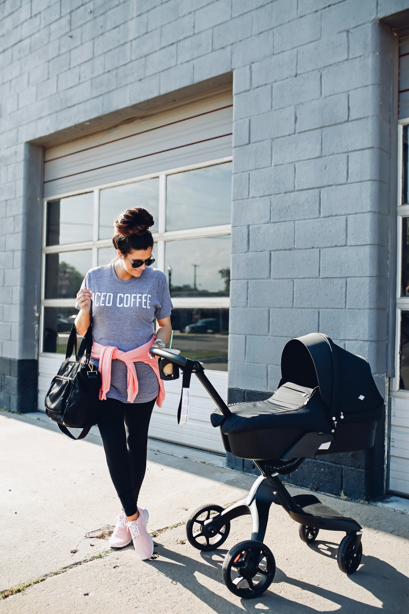 TEE: Private Party (also love THIS tee!) | LEGGINGS: Zella (best. leggings. ever.) | SWEATSHIRT: Wildfox | TENNIS SHOES: Nike (sold out – similar HERE) | NECKLACES: Love Always, Katie Dean Jewelry c/o | WATCH: Michele | SUNGLASSES: Ray-Ban | DIAPER BAG: Prada (discontinued) (similar styles HERE, HERE, & HERE) | STROLLER & BASSINET c/o Stokke