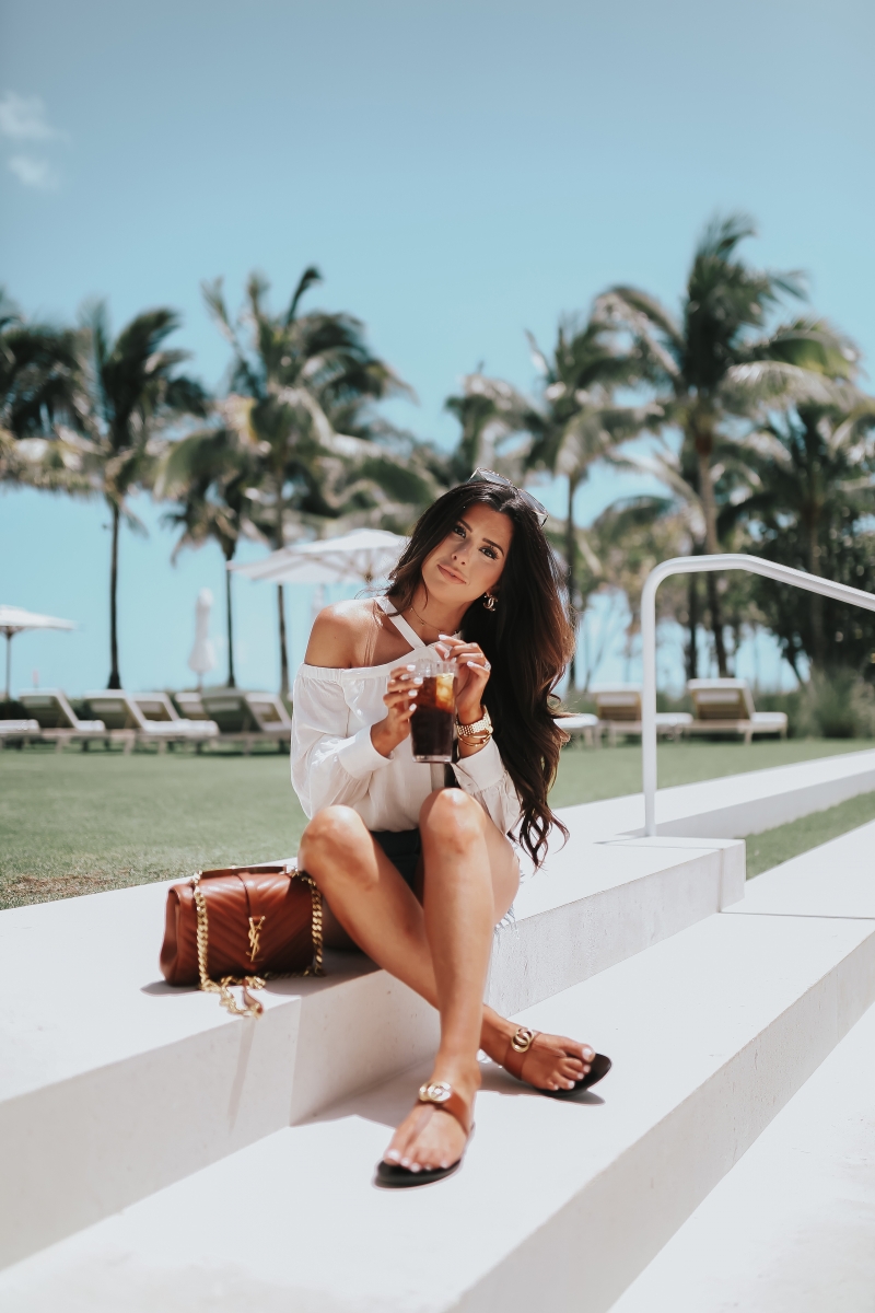 Had to share this outfit from Miami first because it was a FAVE. I have this top in black too and always get tons of compliments when I wear it. I had intended to wear it with jeans out to dinner one night but Miami so hot and humid I stuck w/shorts. These shorts I wear basically daily though – they are high waisted and look like a designer pair I own but I prefer these instead which is crazy! Usually designer pairs are better quality and more flattering but I am obsessed w/these! I wear them w/swimsuits since they cover my high waisted bottoms. 🙂