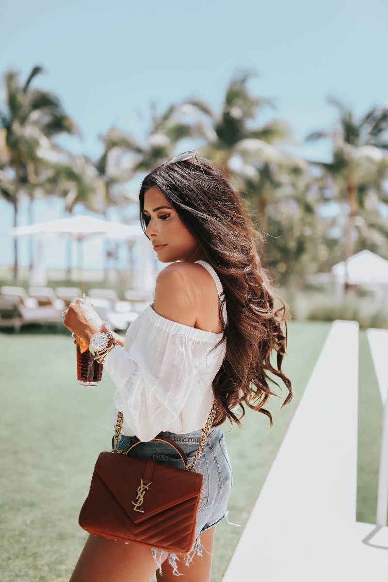 TOP: 1.State [wearing ‘Antique White’ but LOVE the black! Size Small] | SHORTS: Article of Society [$49! I wear them ALL the time- I sized up.] | SANDALS: Gucci | BAG: YSL [similar style HERE] | NECKLACE: Jennifer Zeuner | WATCH: Michele | BRACELET: The Styled Collection | SUNGLASSES: Chloe