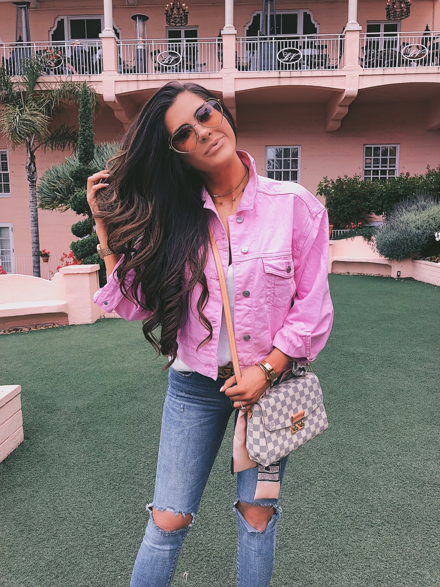 Pink Denim Jacket | Busted Knee Jeans | Heart Sunglasses | Louis Vuitton Croissete in Damier Azur | Wedges [seen in image below]