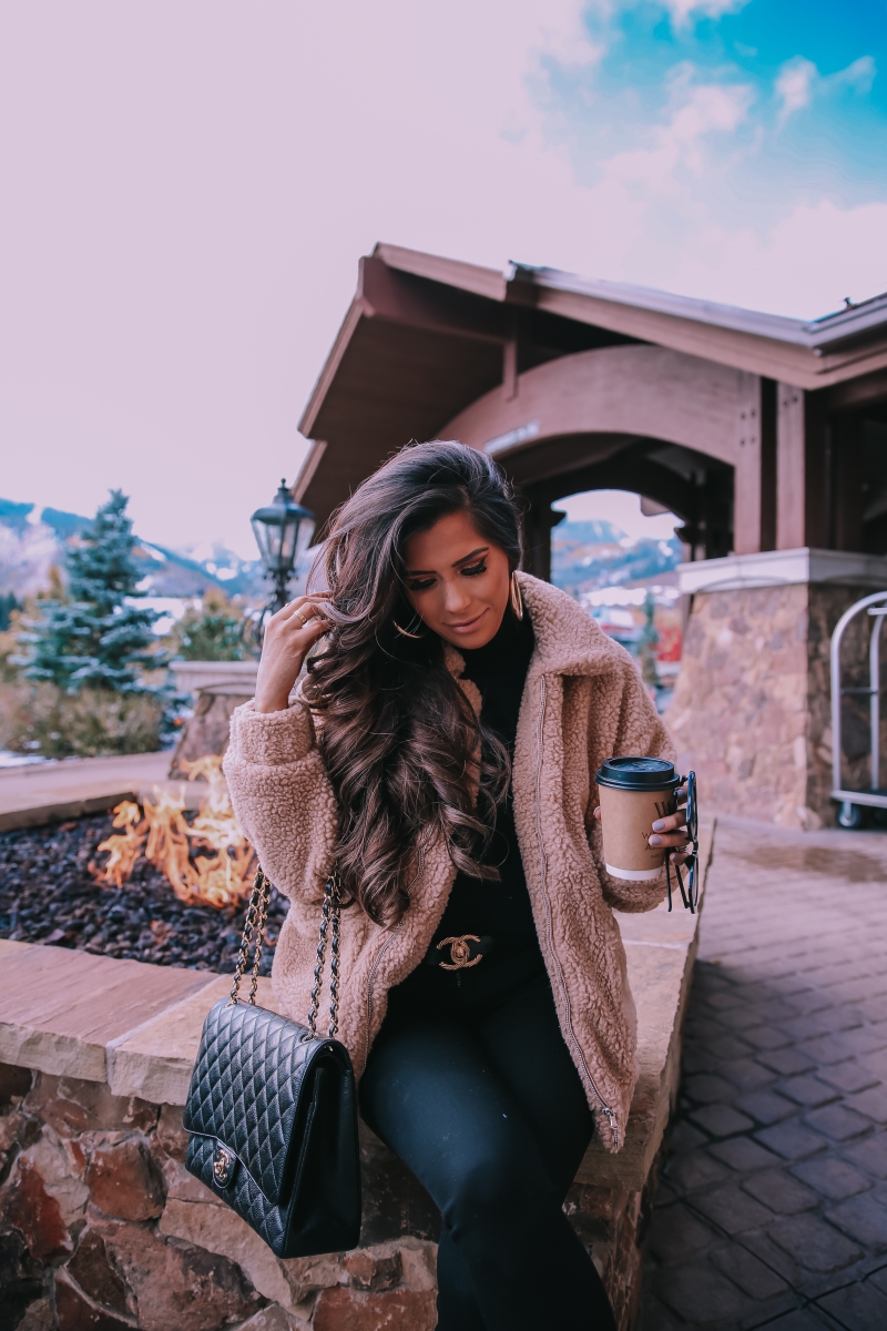 Anyone else so into this trend?!!??! I got one last year in chocolate brown and found very quickly that this trend is definitely one for me! Not only are the jackets so warm and comfortable – like being wrapped in a cozy blanket.. BUT Luke was named ‘Luke Bear’ the second he was born and he has bear outfits in all sizes so I like having a matching jacket.? But on a serious note, this is a trend that grew popular last winter and the jackets sold out very quickly from many retailers. That being said, NOW is the time to hop on board because I am sure they will be selling out quickly again this year. In fact, the exact I Am Gia Teddy Bear jacket I am wearing in the photos above took some time to get. First of all, I ordered a size small in it a couple of months back and when I got it in I realized the small was way, wayyyy too big for me. So I went to order the XS and it was sold out. I finally got ahold of the XS and low and behold it sold out again when I posted about it while in Park City. SO, I had to share this post today [rare Sunday post] because this jack is back in stock for pre-order.