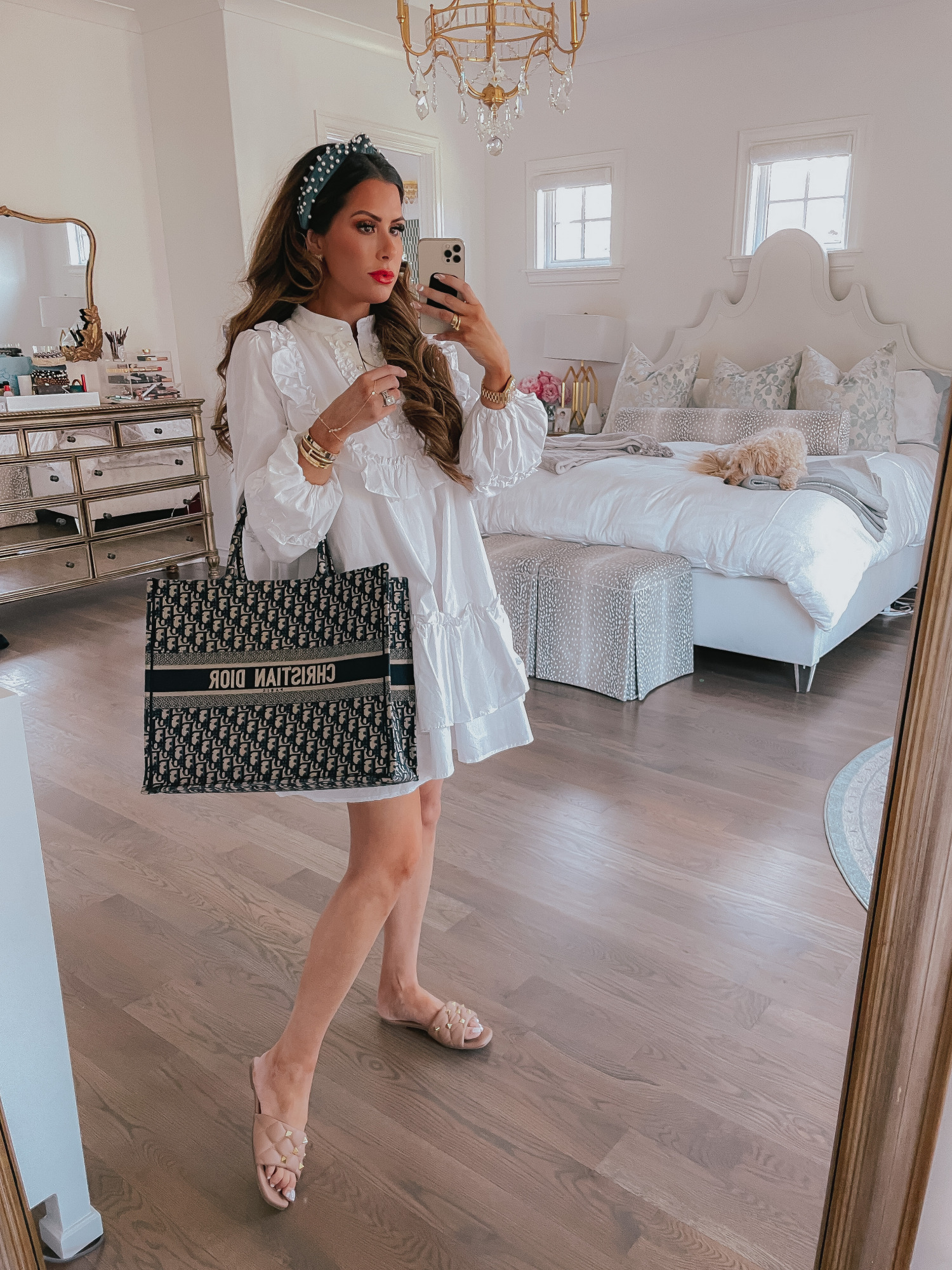 RUFFLE DRESS: Shein | HEADBAND: Amazon [similar options HERE, HERE, and HERE] |BRACELETS: Cartier [similar HERE & HERE] | RINGS: Cartier [similar HERE] | WATCH: Rolex [similar affordable style HERE & HERE] | FINGER CHAIN BRACELET: Lili Claspe | TOTE: Dior [affordable option HERE] | SLIDES: Kell Parker