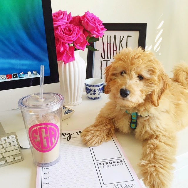 A little bit about Fitz.. He was born August 2014. His a Mini F1B Golden Doodle (this means he has more poodle in him.) Out of all of his sibs, he had the straightest hair – something I thought was kind of cute. He is a light apricot color – we chose him because he had the darkest hair out of all the “cream” shades & because it was a little less wavy. My husband had dog allergies & Fitz does not flare up his allergies at all.